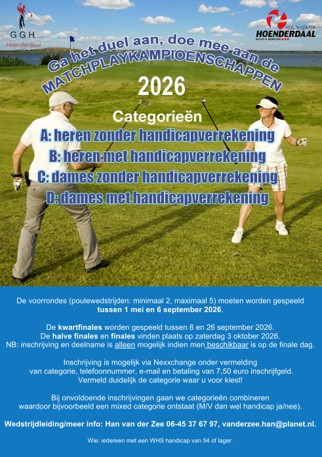 Doe je dit jaar weer mee met de Hoenderdaal Matchplay kampioenschappen 2026? Schrijf je dan vóór 21 april in op Nexxchange. Dat kan vanaf nu, dus wees er snel bij!