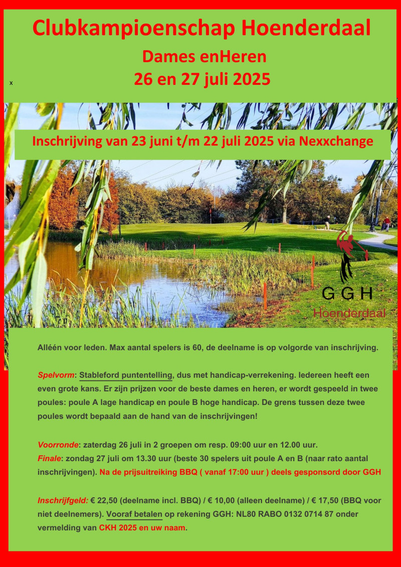 Op 21 en 22 juni zou het Hoenderdaal Clubkampioenschap 2025 plaatsvinden, maar omdat exteem hoge temperaturen werden verwacht heeft de GGH moeten besluiten het evenement uit te stellen om de gezonheid van de spelers niet in gevaar te brengen. De clubkampioenschappen staan nu op de agenda voor het weekend van 26 en 27 juli.