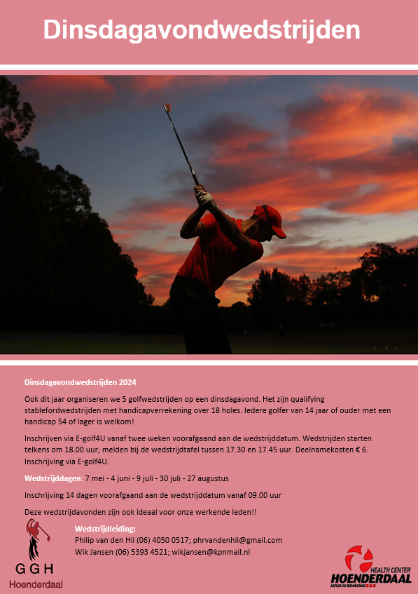 Ook dit jaar organiseren we 5 golfwedstrijden op een dinsdagavond. Het zijn qualifying stablefordwedstrijden met handicapverrekening over 18 holes. Iedere golfer van 14 jaar of ouder met een handicap 54 of lager is welkom!